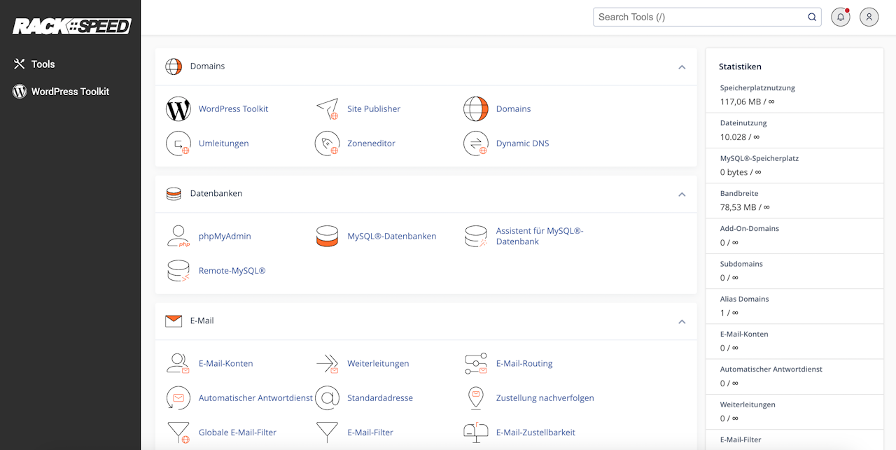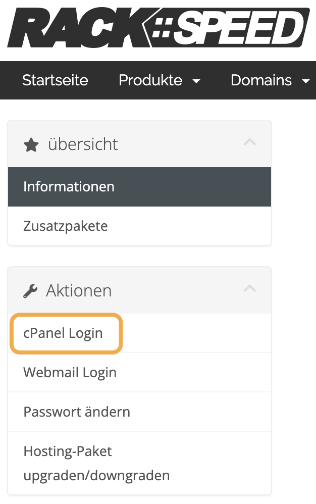 Geben Sie in die Adresszeile Ihres Browsers Ihre Domain ein und hängen Sie /cpanel an diese an. Beispiel: rackspeed.de -> rackspeed.de/cpanel